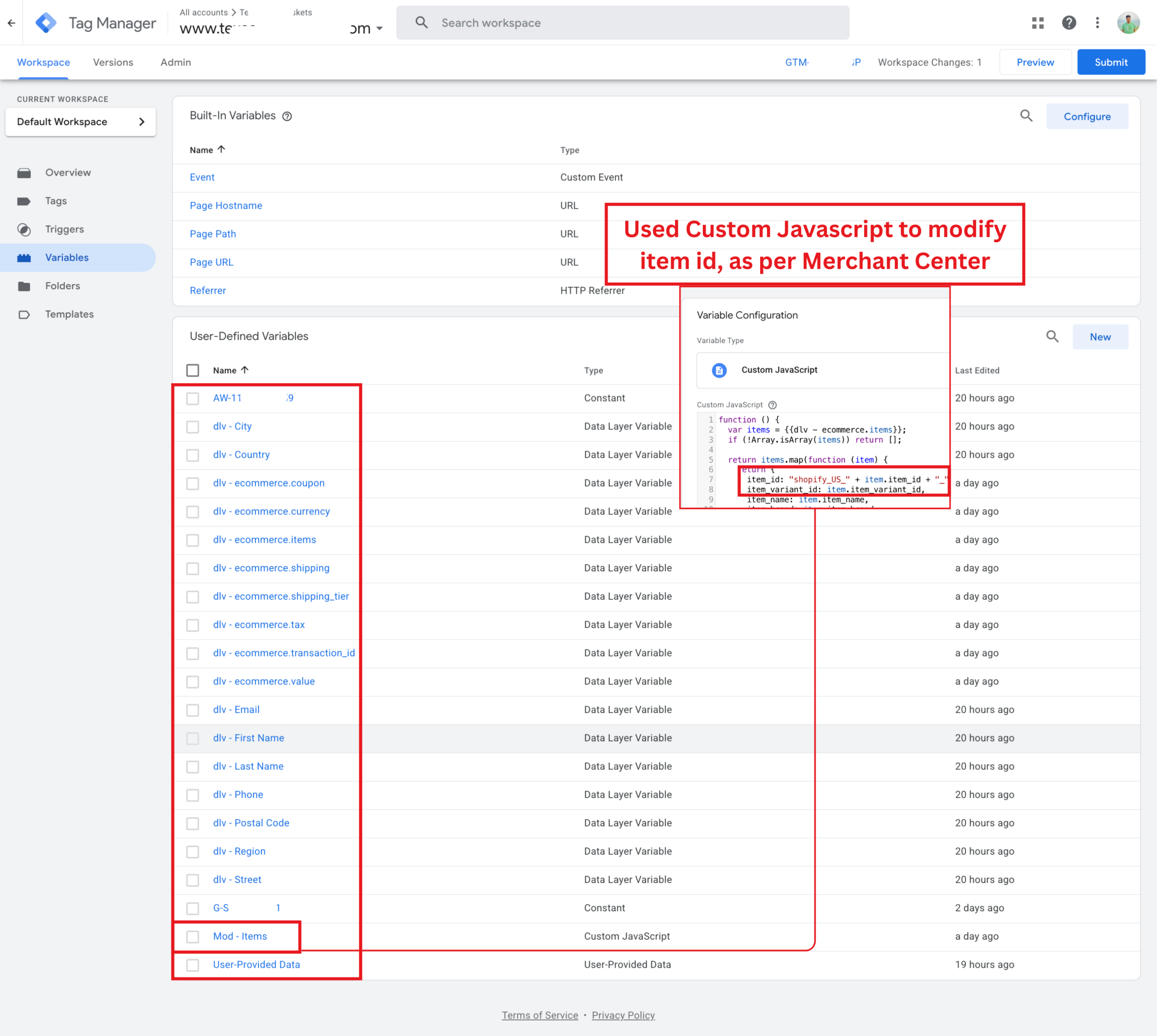 Created a custom JavaScript variable in Google Tag Manager to format Shopify item IDs for GA4.