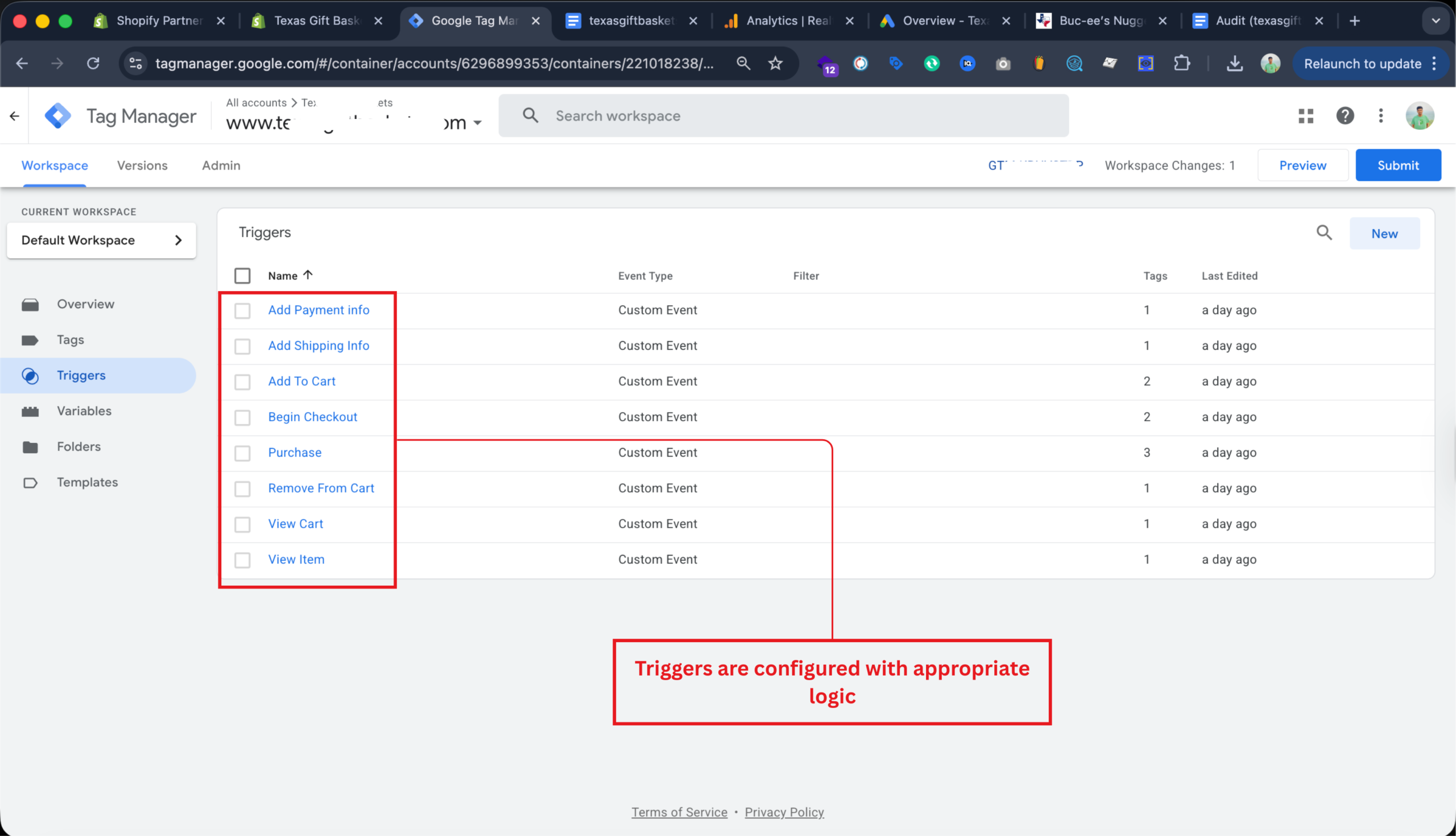 Configured custom triggers in Google Tag Manager for key Shopify ecommerce events.