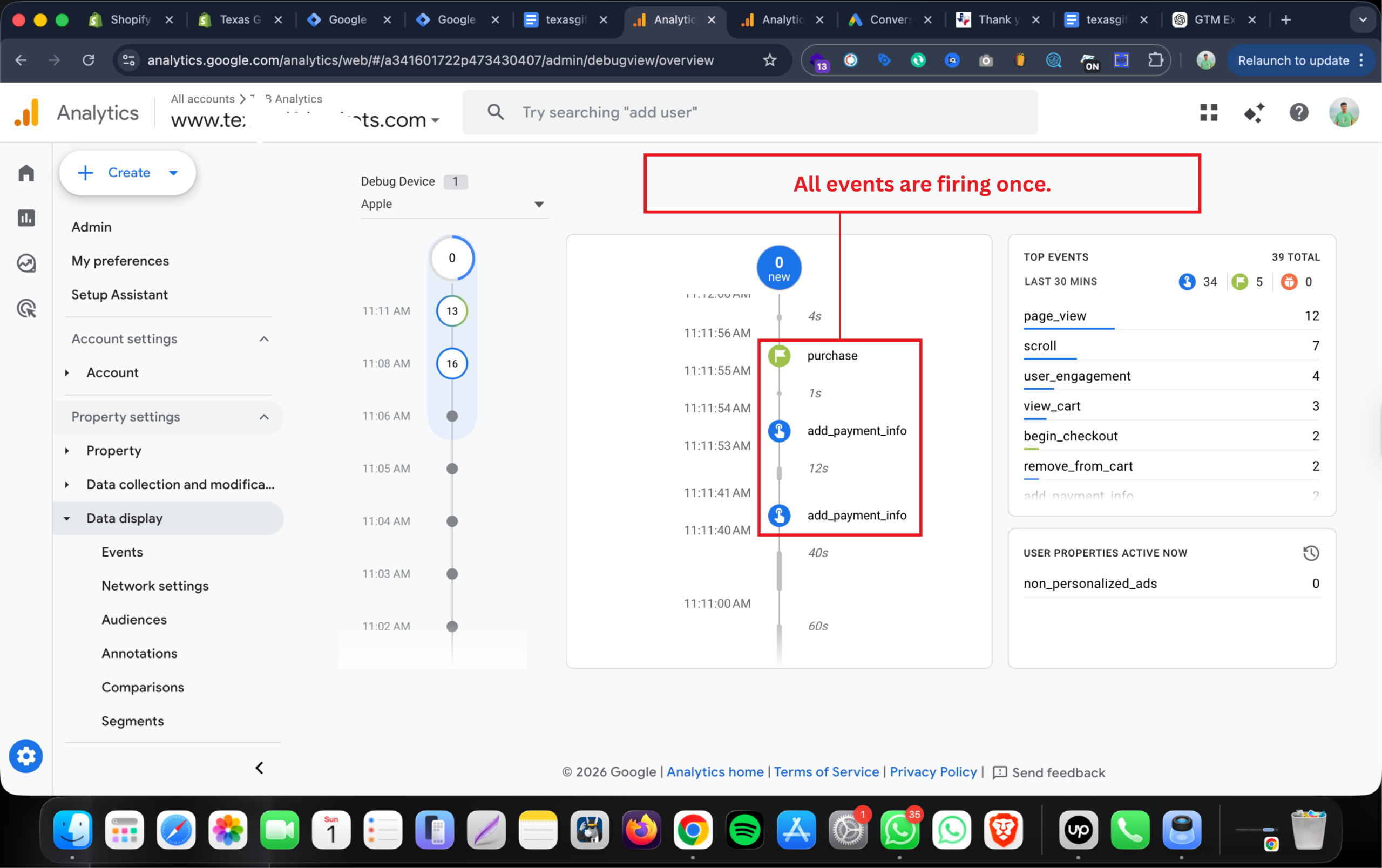 GA4 DebugView showed that a single action was triggering multiple events, including duplicated checkout events.