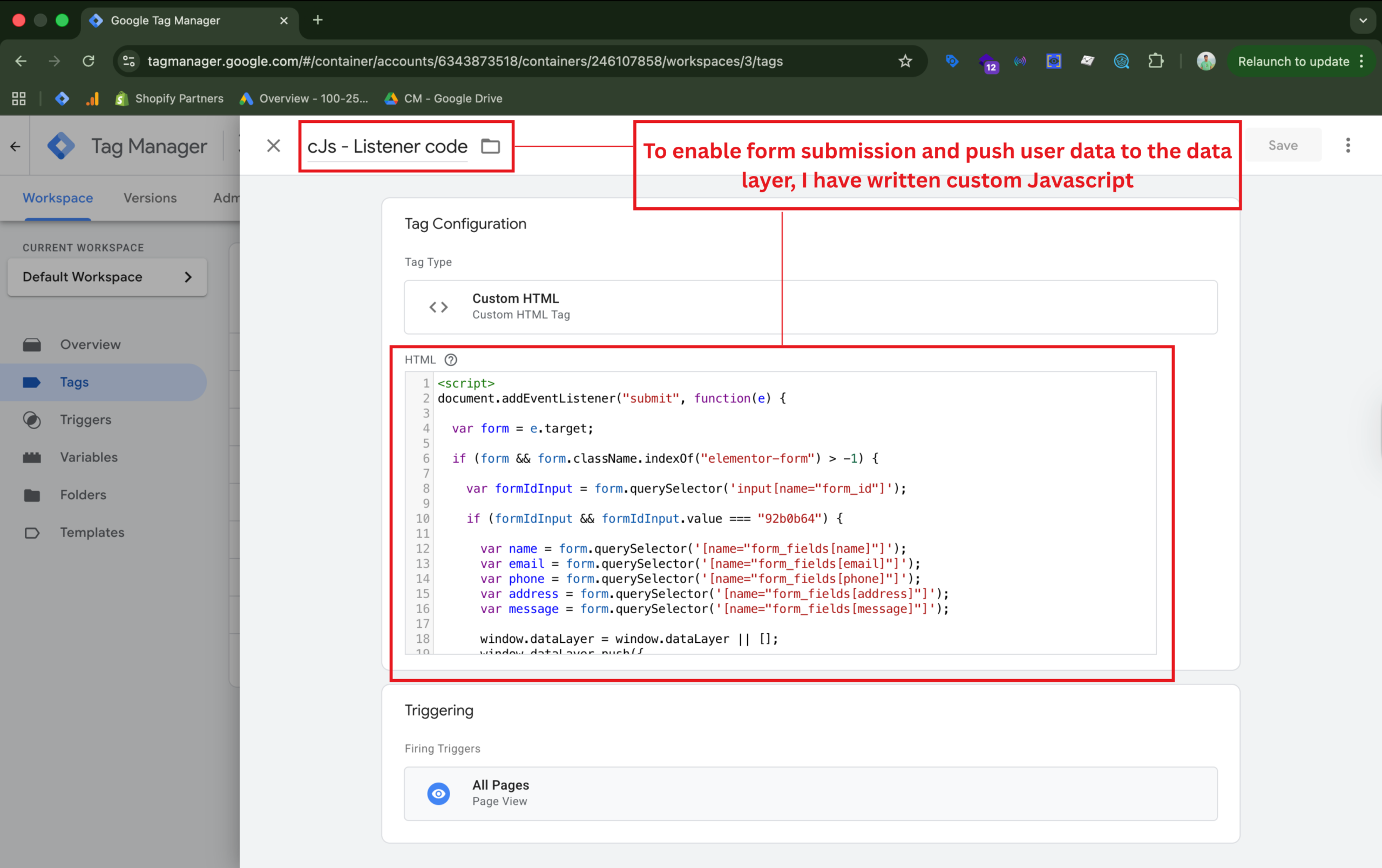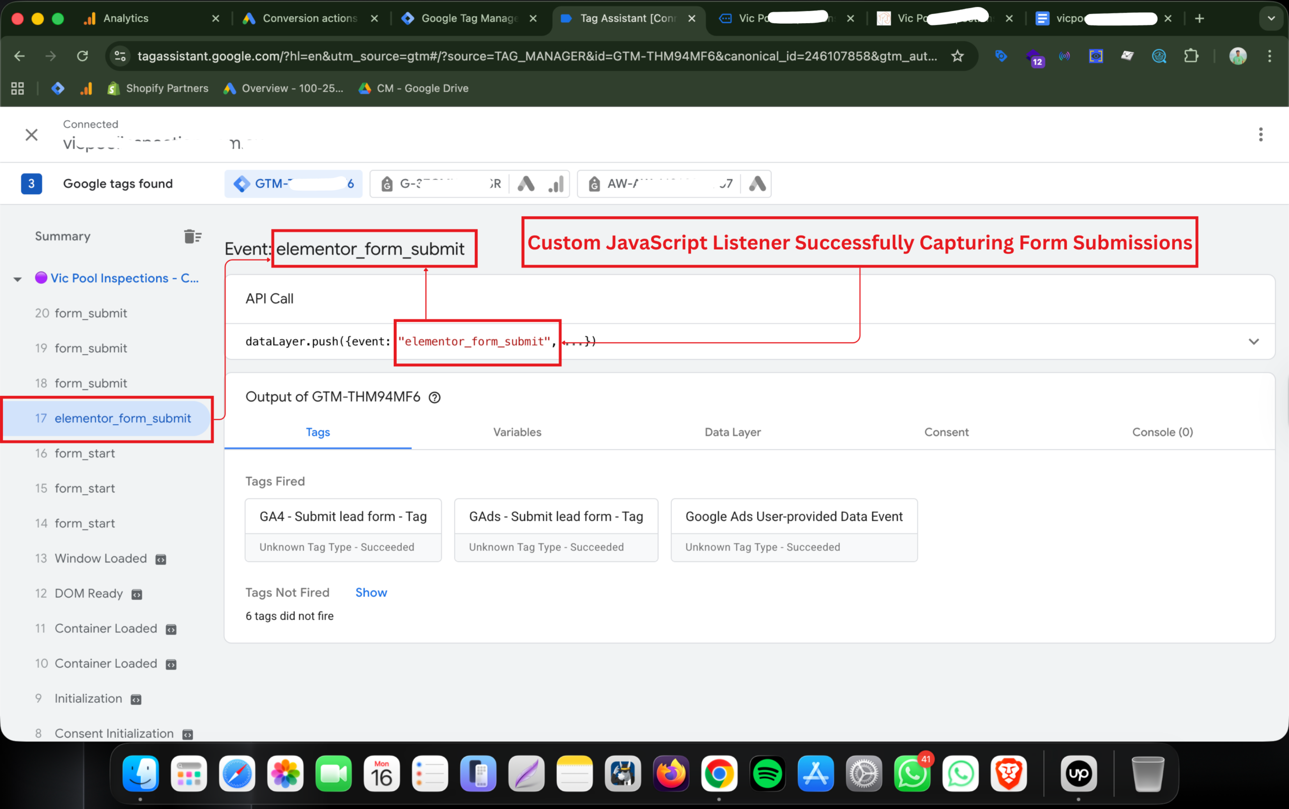A custom JavaScript listener was developed to detect Elementor form submissions and push events into the DataLayer. This ensures accurate lead tracking in GA4 and Google Ads through GTM.