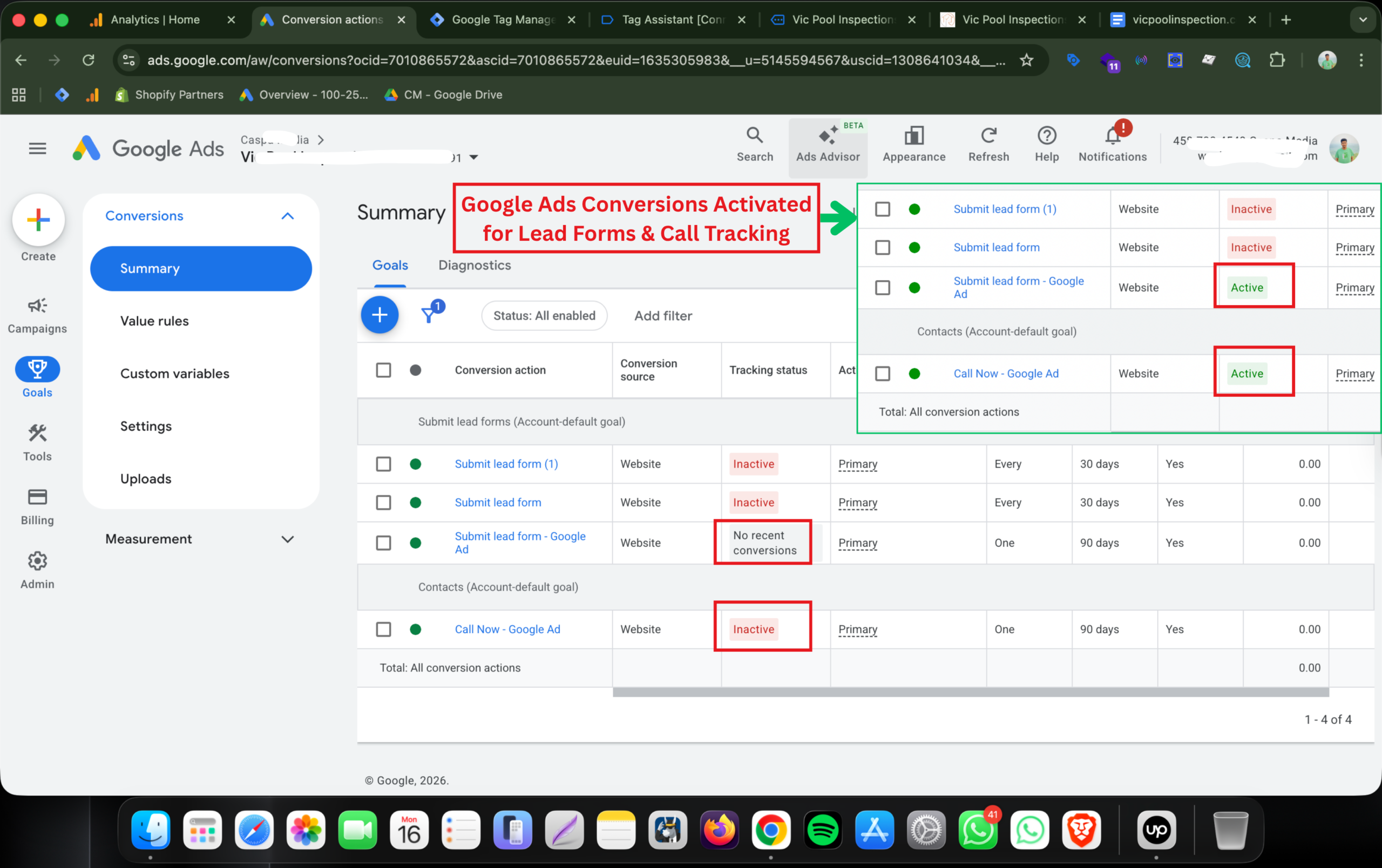 Fixed inactive conversions and successfully activated lead form and call tracking in Google Ads. This enables accurate conversion data, improved targeting, and higher return on ad spend.
